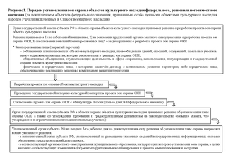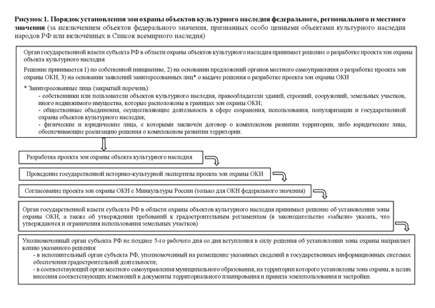 Алгоритм установления зон охраны объектов культурного наследия федерального значения (за исключением объектов, признанных особо ценными объектами культурного наследия народов РФ или включённых в Список всемирного наследия), регионального значения и местного (муниципального) значения представлен на рисунке 1.